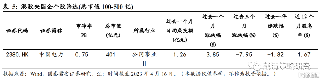 港股高市值、低估值央国企个股筛选:基于前文分析,我们对港股央国企个股池进行以下四个条件的筛选:1)央国企收入占比高的行业;2)高市值:总市值大于1000亿、500-1000亿和100-500亿;3)低估值:目前估值(市净率)分别低于1/0.7/0.5的公司;4)高流动性:过去一个月日均成交额大于1个亿。