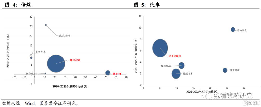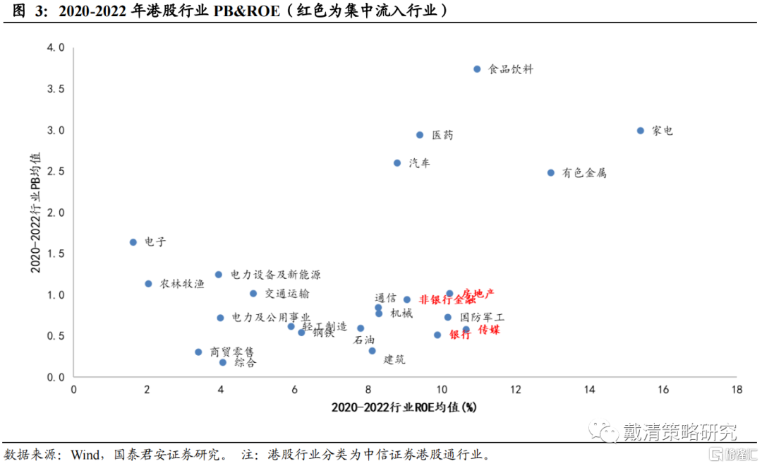 在港股,内资更青睐高ROE、低估值行业。2020年1月1日至2022年12月31日,南下资金累计净流入港股1127.2亿元,净流入排名居前的港股行业包括传媒(+174.4亿元,三年平均ROE10.7%)、房地产(+124.4亿元,三年平均ROE10.2%)、非银金融(+94.1亿元,三年平均ROE9.1%)和银行(+73.9亿元,三年平均ROE9.9%),指向内资更注重盈利能力的稳定性,整体上大规模配置高ROE行业,并追求用更低的估值买入。其中,汽车和医药等行业虽然在估值方面不占优势,但由于过去三年属于景气行业具有高成长性,同样获得大幅增配,分别获得加仓114.1亿元和55.0亿元。