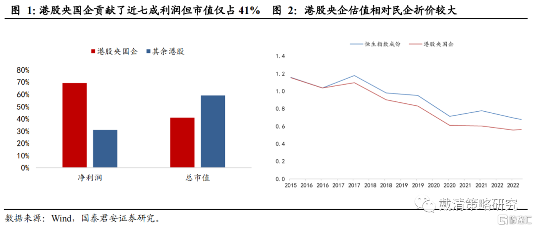 国有企业估值较民企折价较大。港股有很多传统的央国企公司,国企改革时期,大批央国企选择赴港上市。目前,港股央国企有322家,占比仅12%,但贡献了港股大部分的利润。以归母净利润计算,国有企业占比69%,然而国有企业的市值占比仅为41%。估值方面相对民企的折价不断加深。截至2022年底,港股央国企的平均市净率为0.56倍,低于恒生指数的0.68倍,且折价不断加深。