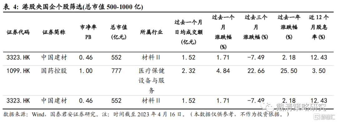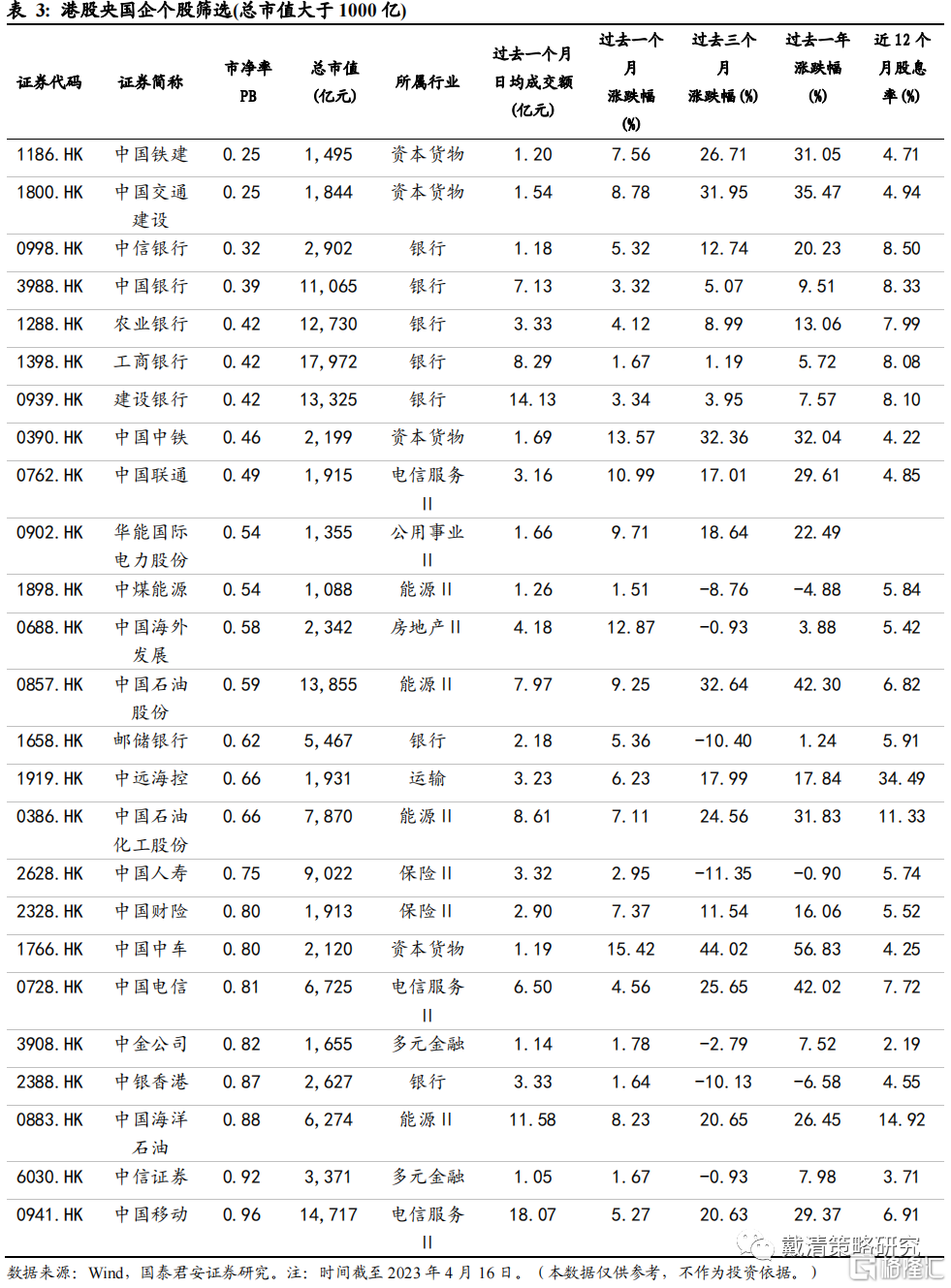 从投资机会来看,基于前文分析,我们对港股央国企个股池进行以下四个条件的筛选:1)央国企收入占比高的行业;2)高市值:总市值大于1000亿、500-1000亿和100-500亿;3)低估值:目前估值(市净率)分别低于1/0.7/0.5的公司;4)高流动性:过去一个月日均成交额大于1个亿。