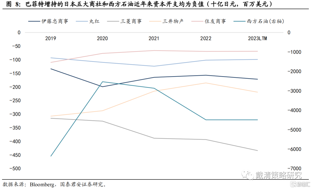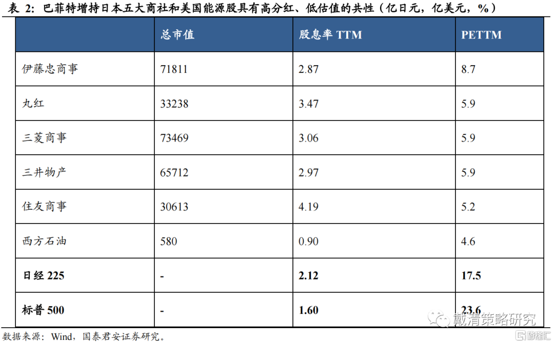 巴菲特持续增持日本高分红、低估值、低资本开支的商社股。日本相对稳定甚至略显僵化的政治格局,在全球动荡的大背景下反而成为了“避风港”。美国“股神”巴菲特近日的日本行再次将日本拉回了大众视野,自2020年8月以来,巴菲特已经三次购买并扩大了对日本五大商社的股份持有量,包括伊藤忠商事、丸红、三菱商事、三井物产和住友商事。2022年秋,伯克希尔-哈撒韦又宣布将5家商社的持股比例分别提高至6%左右。根据彭博数据显示,截至2022年底,伯克希尔-哈撒韦持有丸红6.8%的股份,三菱、三井住友和住友商社的股份均为6.6%,伊藤忠的股份则为6.2%。观察日本商社股,我们可以发现它们具有高分红(当时商社的股息率接近5%,高于日股的平均水平2%)、低估值(市盈率约为6倍,低于日经225市盈率17倍)和资本开支少的共性。