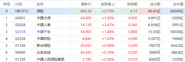 4月18日,港股保险股多数走强,截至发稿,中国太保(02601)涨4%、中国人寿(02628)、中国平安(02318)、新华保险(01336)等股拉升跟涨。