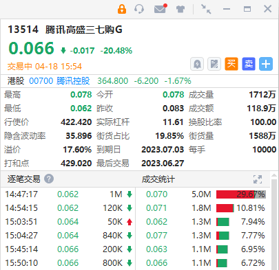 腾讯购13514,行使价422.42港元,2023年7月3日到期,实际杠杆11.4倍,轻微价外、高杠杆