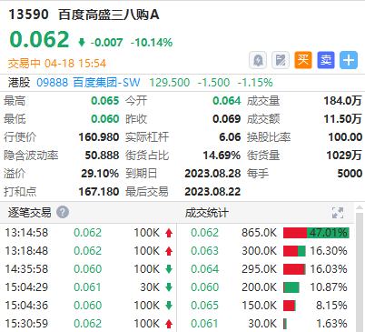 百度熊57389,收回价160港元,行使价162港元,换股比率500,杠杆比率4.2倍,远熊