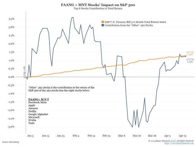 截至目前,标普500指数中剩余的492只股票的整体表现甚至不及现金。他们今年共同推动标普500指数上涨1.24%(蓝色)。现金(橙色)今年迄今上涨1.29%。