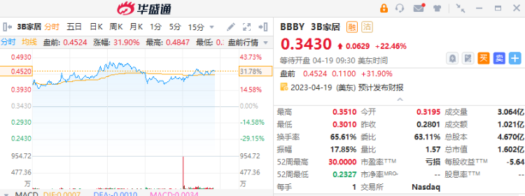 昨日大涨22%的3B家居(BBBY.US)盘前继续涨31.90%,报0.4524美元。据悉,公司寻求在4月26日之前筹集3亿美元,以避免破产。截至2023年4月10日,3B家居(BBBY.US)通过出售1.01亿股股票筹集了约4850万美元。
