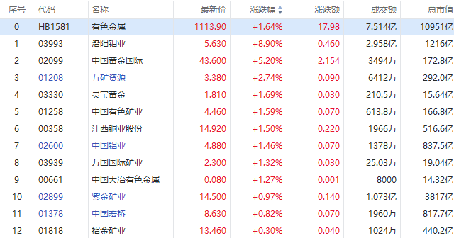 4月19日,洛阳钼业开盘拉升,现涨8.9%领涨有色金属股,股价报5.63港元,成交额2.95亿港元。其他成分股中,中国黄金国际涨超5%,五矿资源涨2.74%,灵宝黄金、江西铜业股份、中国铝业涨逾1%,紫金矿业涨0.97%报14.5港元,招金矿业跟涨。