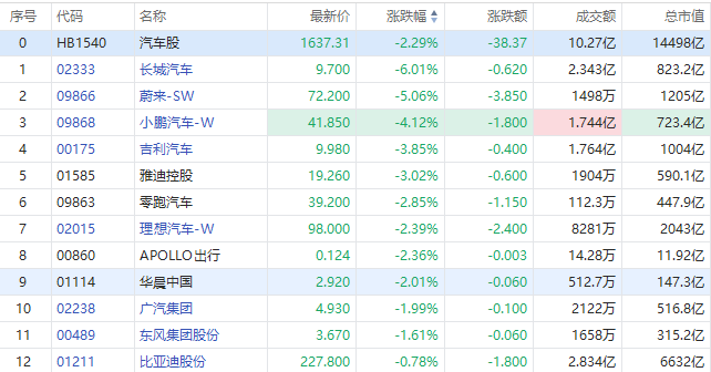 华盛资讯4月19日消息,港股汽车股整体走弱。截至发稿,长城汽车跌超6%报9.7港元每股,成交额2.34亿港元;蔚来-SW跌逾5%,小鹏汽车-W跌4.12%报41.85港元,成交额1.74亿港元,吉利汽车跌3.85%,零跑汽车、理想汽车-W跌超2%,广汽集团跟跌,比亚迪股份跌0.78%。