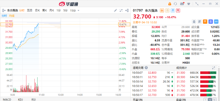 东方甄选(01797)早盘逆市走强,截至发稿,现涨10.47%,报32.7港元每股,成交额3.82亿港元。