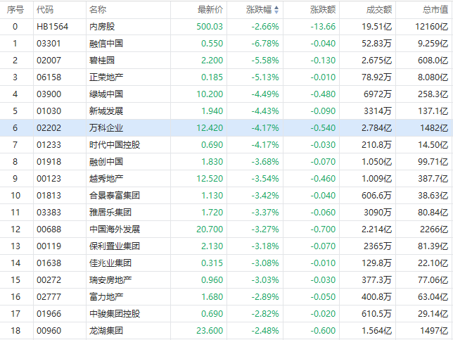 4月19日,港股内房股普跌。截至发稿,融信中国跌6.78%领跌,碧桂园跌5.58%报2.2港元每股,成交额2.67亿港元;正荣地产跌逾5%;绿城中国、新城发展跌超4%,万科企业跌4.17%报12.42港元每股,成交额2.78亿港元,雅居乐集团、中国海外发展跌超3%,融创中国跌3.68%报1.83港元;佳兆业集团、龙湖集团跟跌。