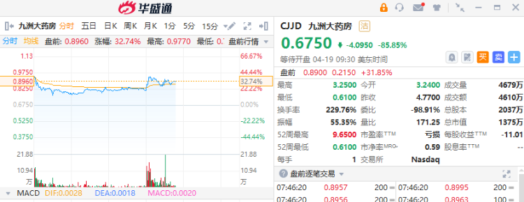 九洲大药房盘前反弹31%,以3.10美元增发股票筹集700万美元,昨日暴跌85.8%