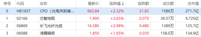 4月20日,港A股CPO概念股继续走强,截至发稿,港股方面,芯智控股涨3.65%报1.99港元每股,长飞光纤光缆涨2.98%报16.58港元每股,成交额1389万港元,鸿腾精密跟涨1.65%。
