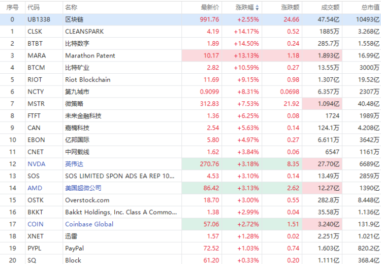 周三,美股区块链概念股普涨,截至发稿,比特数字涨超14%报1.89美元,Marathon Patent涨超13%,比特矿业涨超10%,嘉楠科技涨超5%,Coinbase Global $COIN 涨2.72%,PayPal、Block跟涨。比特币再次升破30000美元,日内涨幅近10%。