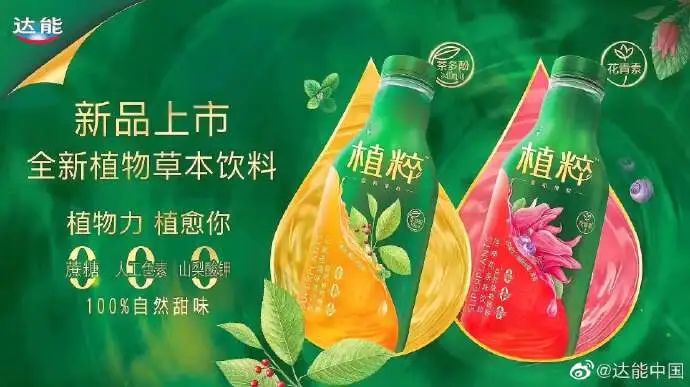 就在前不久,达能官宣推出了一款名为“植粹”的即饮茶产品,共有洛神花茶味和马黛茶调味两种风味。其中,洛神花茶味饮料添加了洛神花、蓝莓、欧洲接骨木莓,没有加入任何蔗糖、山梨酸钾和人工色素,主打纯粹植物力量,具有天然花香和茶香。