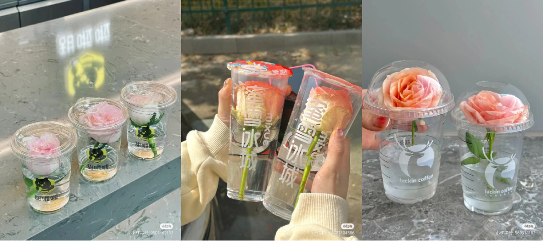 只需一朵新鲜的玫瑰花,一个透明奶茶杯,再加入冰块和纯净水进行封口,简单的几步操作,消费者就能获得一杯浪漫满分的“冰封玫瑰”。个性十足的鲜花奶茶杯亮眼吸睛,吸引了不少消费者争相打卡,不但一跃晋升为今年情人节最火的定制周边产品,后期更是逐渐吸引了越来越多的品牌加入到本次鲜花杯营销的狂欢阵列。