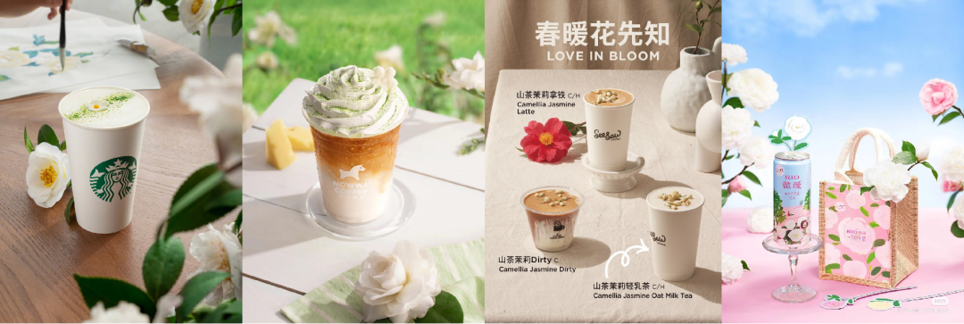 星巴克在白色情人节特别上新了山茶花漾拿铁,NOWWA挪瓦咖啡推出了山茶花半熟芝士拿铁,Seesaw咖啡今年以山茶和茉莉为主题的“春暖花先知”系列......而除了现制饮品,RIO今年的春季限定微醺同样也是山茶花青提风味,并联名了人气插画师卤猫共同打造酒罐外观设计,春日气息满满。