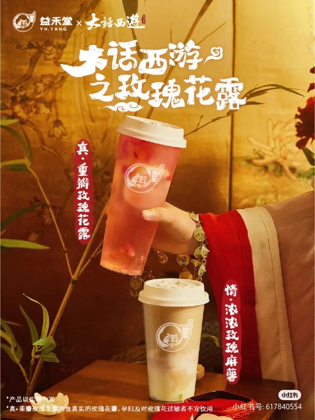 例如,1点点在情人节重磅推出的“玫瑰奶乌”是云南昆明重瓣红玫瑰花酱与乌龙茶的搭配;阿嬷手作首次推出的“岩韵玫瑰”,是用重瓣玫瑰花酱与矮脚乌龙茶王、水牛奶、土蜂蜜进行搭配;茶颜悦色新品“藏不住的”是在花香红茶的茶底中加入来自保加利亚的大马士革玫瑰纯露,奶沫上再撒上玫瑰花瓣;益禾堂在情人节推出与大话西游联名的玫瑰系列,用到的则是平阴重瓣玫瑰......