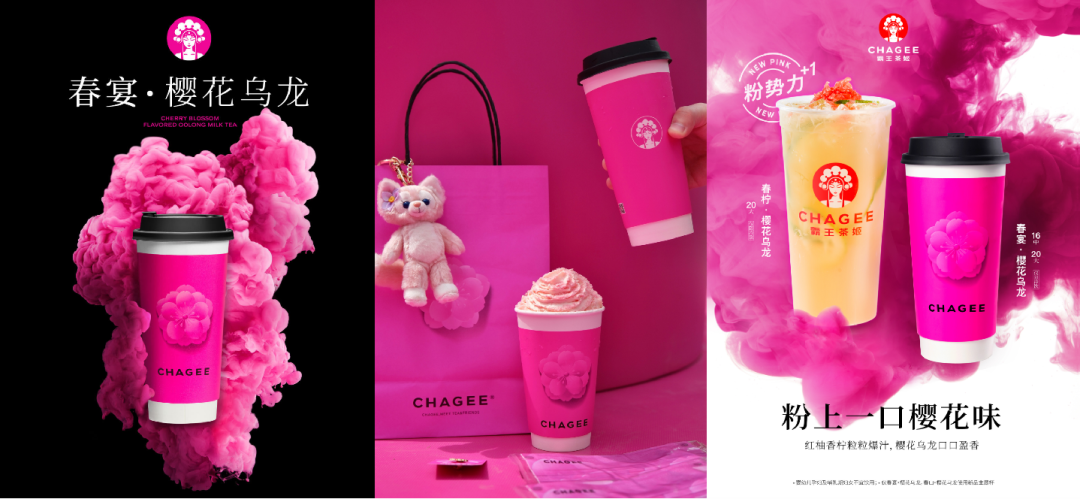 可以看到,以樱花为主题,霸王茶姬不仅推出了三款特别的樱花乌龙茶饮(春宴·樱花乌龙、春山·樱花乌龙、春江·樱花乌龙),更是将饮品包装以及整体的门店风格都统一换成了高饱和度的粉色调,樱花口罩、胸针、纸袋等周边以及线下主题快闪店也同步上线,并在线上大力营造#霸王茶姬粉了#话题,不但引发了网友的广泛关注和讨论,也成功吸引了大批粉丝拍照打卡。