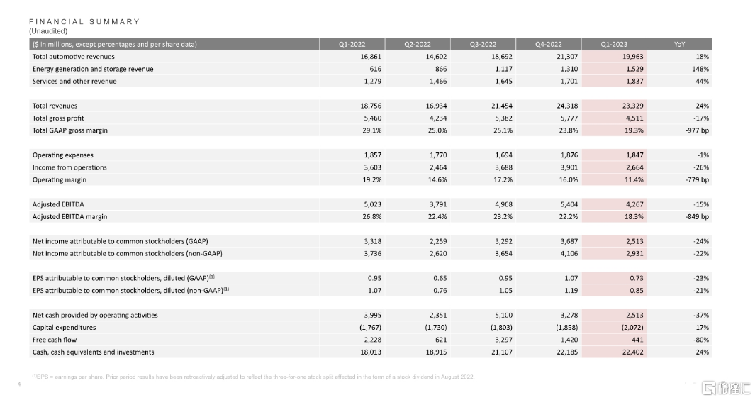 财报显示,特斯拉在第一季度总营收为233.29亿美元,与去年同期的187.56亿美元相比增长24%,较去年四季度的243.18亿美元也有所下降,高于市场预期的232.08亿美元。