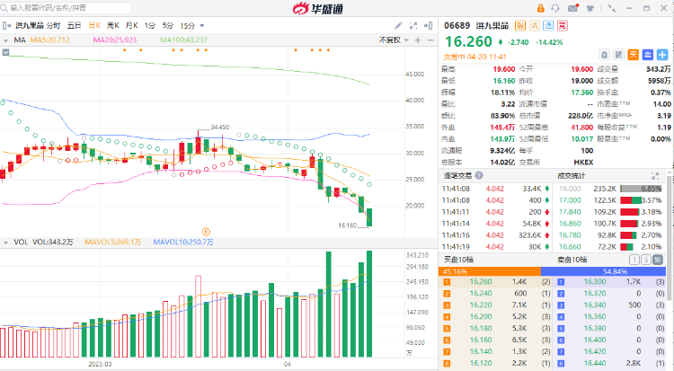 洪九果品再度暴跌14%,自高点暴跌60%,公司成功按配售价每股配售股份23.61港元向23名承配人配售合共1496万股配售股份,分别占经配发及发行的配售股份扩大后的H股数目的约1.58%以及已发行股份总数的约1.06%。