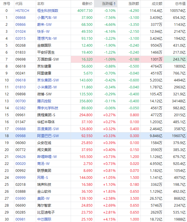 科网股涨跌互现,美团-W涨2.58%,报139.1港元每股,网易-S涨逾1%,商汤-W、哔哩哔哩-W涨0.73%;阿里巴巴-SW微涨0.33%;腾讯控股微跌0.11%,快手-W跌逾4%报49.55港元每股,成交额12.94亿港元,此前遭腾讯旗下公司分派5115万股快手B类股。