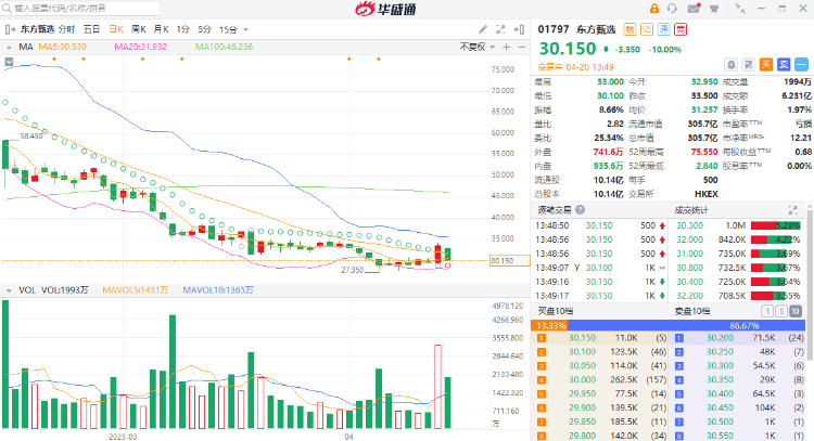 4月20日讯,新东方财报公布后,东方甄选股价持续走低。截至发稿,跌10%报30.15港元每股,成交额6.23亿港元,最新市值305.7亿港元;新东方-S午后则升超10%。