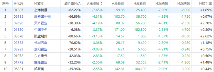 上海复旦A股跌7.65%,H股现跌7.3%,康希诺生物A股跌4.31%,H股现跌4.33%,天齐锂业A股跌4.19%,H股现跌4.01%。