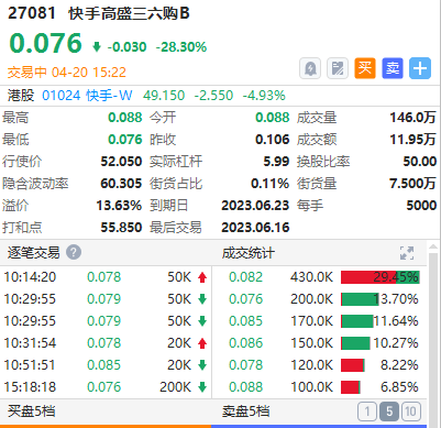 快手购27081,行使价52.05港元,2023年6月23日到期,实际杠杆5.7倍,贴价