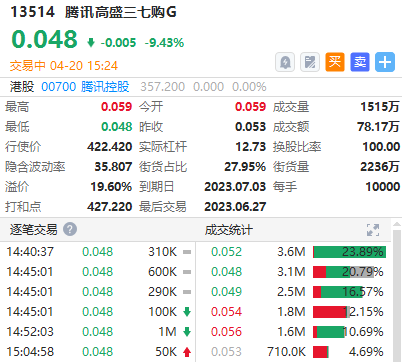 腾讯购13514,行使价422.42港元,2023年7月3日到期,实际杠杆12.1倍,轻微价外、高杠杆