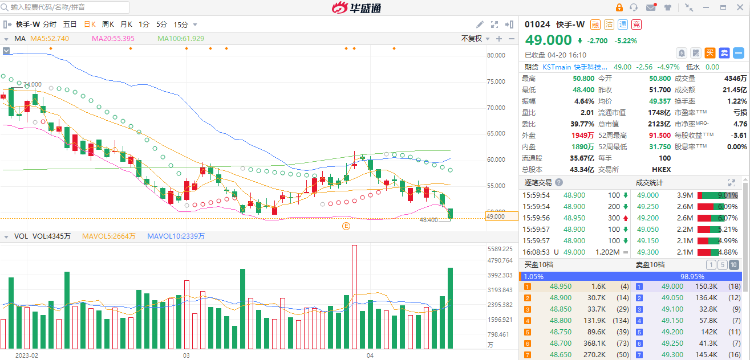快手受减持消息影响,昨日跌约4.4%,今早继续下跌。早上低开约1.7%后失守50港元水平,最低见48.4港元,创近5个月新低。