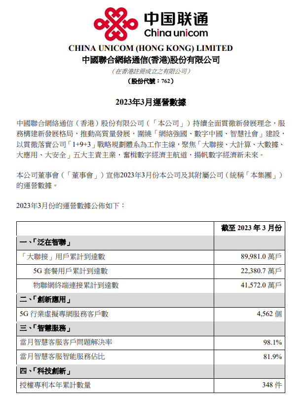 4月20日消息,中国联通今日下午在港交所发布公告,披露了2023年3月运营数据。数据显示,中国联通截至2023年3月 5G 套餐用户数已达2.238亿户。大联接用户数 8.998 亿户,物联网用户数约 4.157 亿户。