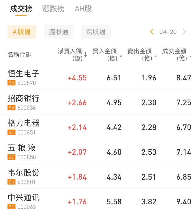 北向资金今日净买入46.91亿元。恒生电子、招商银行、格力电器分别获净买入4.55亿元、2.66亿元、2.14亿元。隆基绿能净卖出额居首位,金额为7.87亿元。