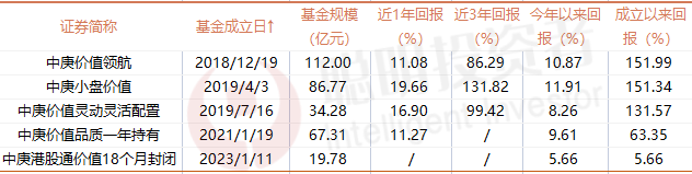 其中,最早成立的中庚价值领航涨了10.87%。自2018年12月19日,该基金成立以来回报为151.99%。