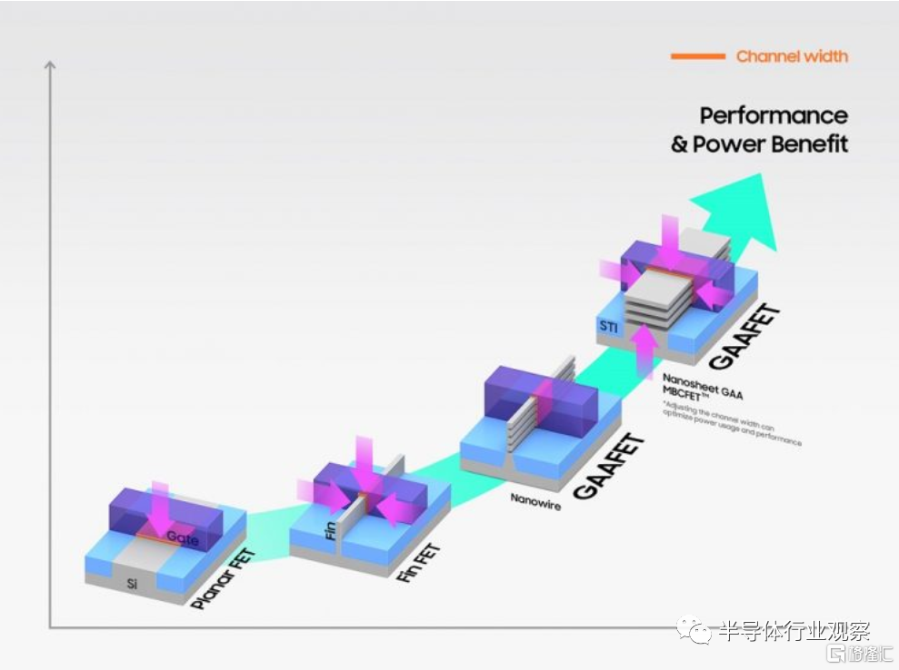 2022年六月,三星宣布已开始了采用环栅 (GAA) 晶体管架构的 3 纳米 (nm) 工艺节点的初始生产。其中用到的多桥通道 FET (MBCFET ) 是三星首次采用的 GAA 技术,该工艺突破了 FinFET 的性能限制,通过降低电源电压水平提高功率效率,同时还通过增加驱动电流能力提高性能。该公司也正在开始将纳米片晶体管与半导体芯片一起用于高性能、低功耗计算应用,并计划扩展到移动处理器。