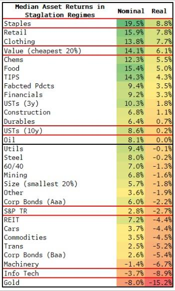 以往的滞涨周期表明,资产回报往往与今年迄今的表现大相径庭。换句话说,有许多资产可能被严重低估或高估了,石油公司、大宗商品和金融股属于前者,而黄金、科技和汽车行业则属于后者。