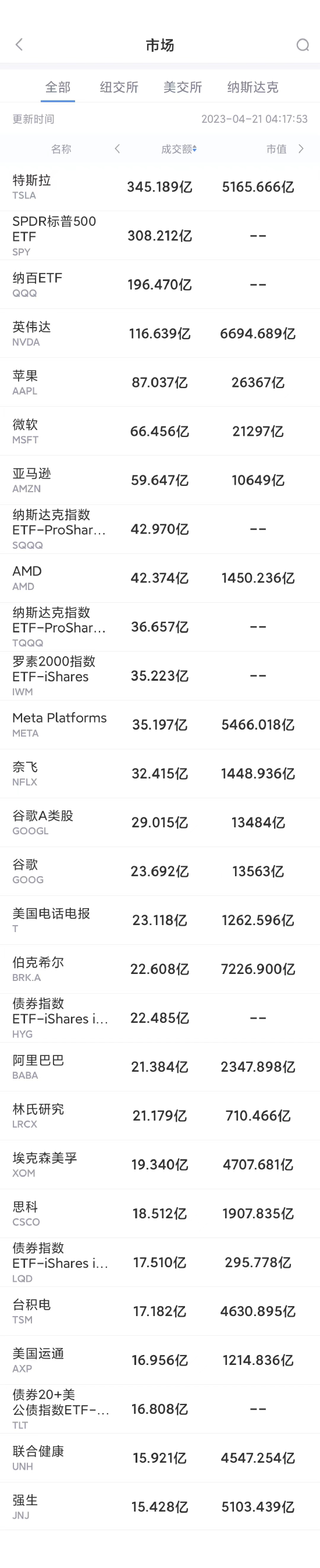 以下为美股当日交易最活跃的20只股票(按成交额):