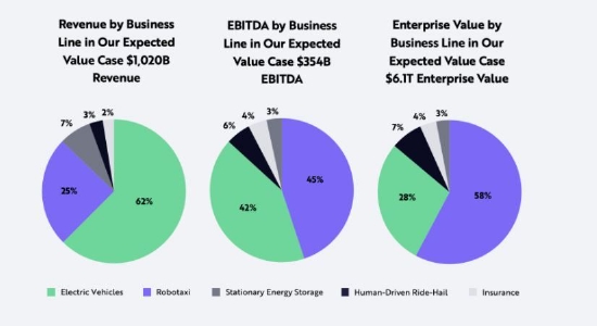 报告称,特斯拉未来的自动驾驶出租车业务线是一个关键驱动力,在2027年将贡献58%的预期企业价值和45%的预期EBITDA(息税折旧摊销前利润)。方舟预测,到2027年,特斯拉的电动汽车业务将占营收的62%,其利润率远低于自动驾驶出租车业务。自动驾驶出租车业务将占到总营收的25%。如下图所示: