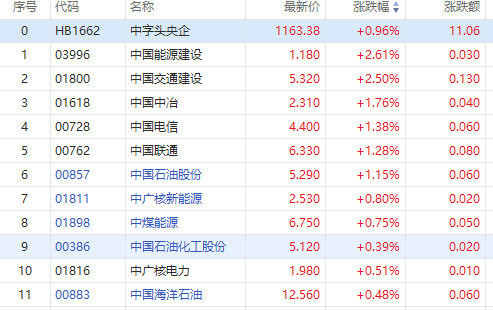 4月21日消息,港股中字头央企快速拉升,截至发稿,中国交通建设、中国能源建设涨近3%,中国中冶涨近2%,中国电信、中国联通、中国石油股份涨超1%,中广核新能源等跟涨。