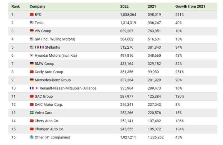 2022年是电动汽车又一个值得铭记的年份,当年新能源车年产量首次超过1000万辆,前一年的总产量只有670万辆。对于中国电动车行业来说,2022年同样值得纪念,国产品牌比亚迪全年产量首次超过特斯拉,超过180万辆。