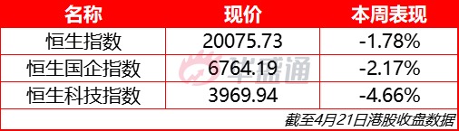 恒生指数本周跌1.78%,报20075.73点;国企指数本周跌2.17%,报6764.19点;恒生科技指数本周跌4.66%,报3969.94点;