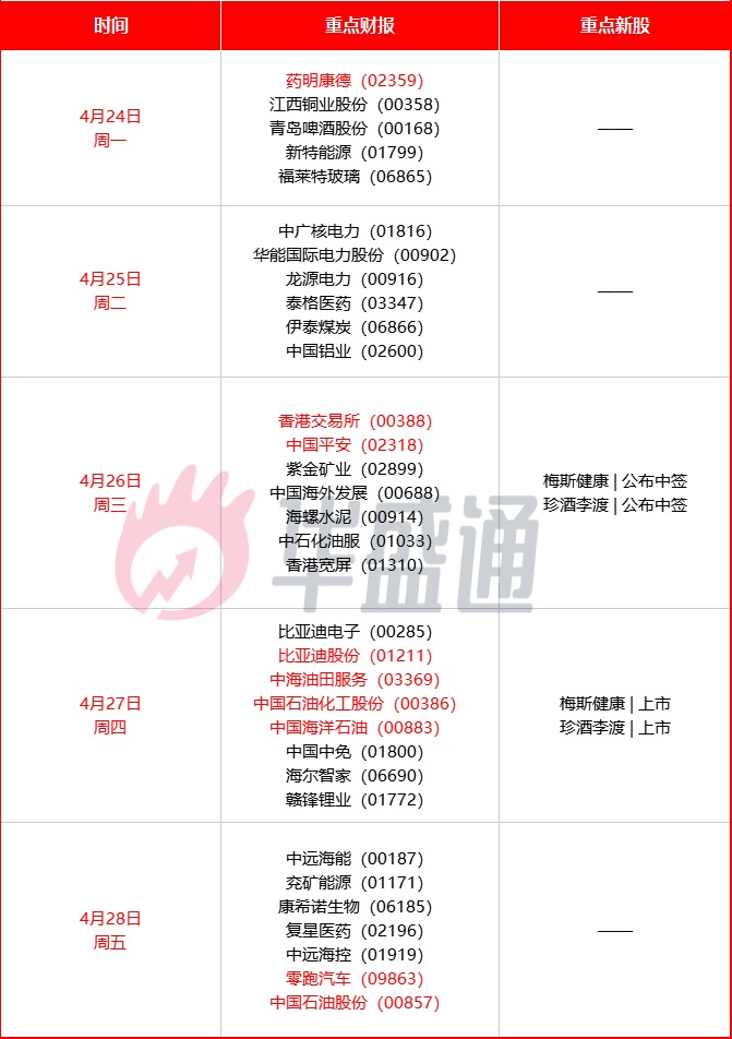 港股财报方面,下周重点关注药明康德、香港交易所、中国平安、比亚迪股份、中石化、中海油、中国石油、零跑汽车等。新股方面,珍酒李渡、梅斯健康将于下周四上市。