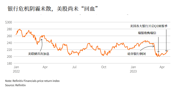 Refinitiv Financials的价格回报指数在13个交易日内下跌了16%,如此幅度在过去十年中仅有一次,即疫情首次爆发之际。即使现在对二次银行挤兑的担忧已逐渐消退,银行业也只收复了约一半的跌幅。
