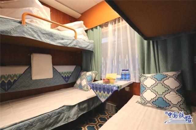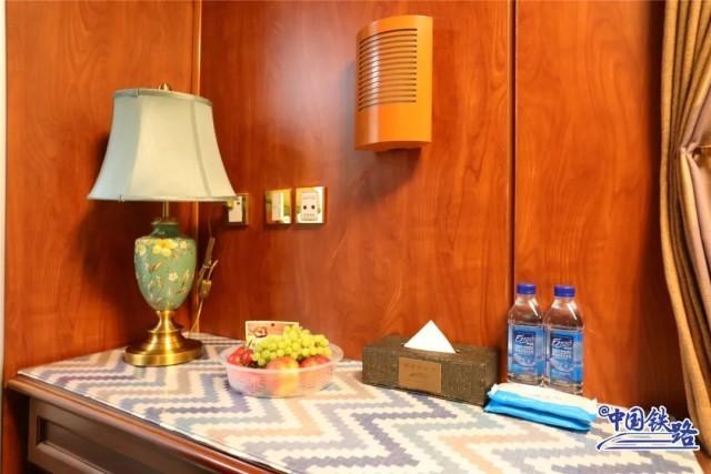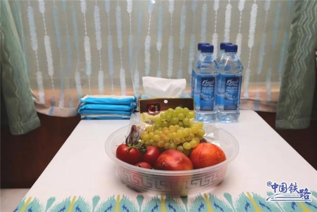 每间软卧包厢都放置有新鲜的水果,全车提供24小时热水,方便旅客随时冲淋。列车上还会每日广播景点天气预报,方便旅客随时掌握当地天气状况,添减衣物。