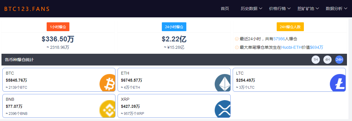 公开数据显示,近24小时有57964人爆仓,2.22亿美元(约15.27亿元人民币)资金蒸发。