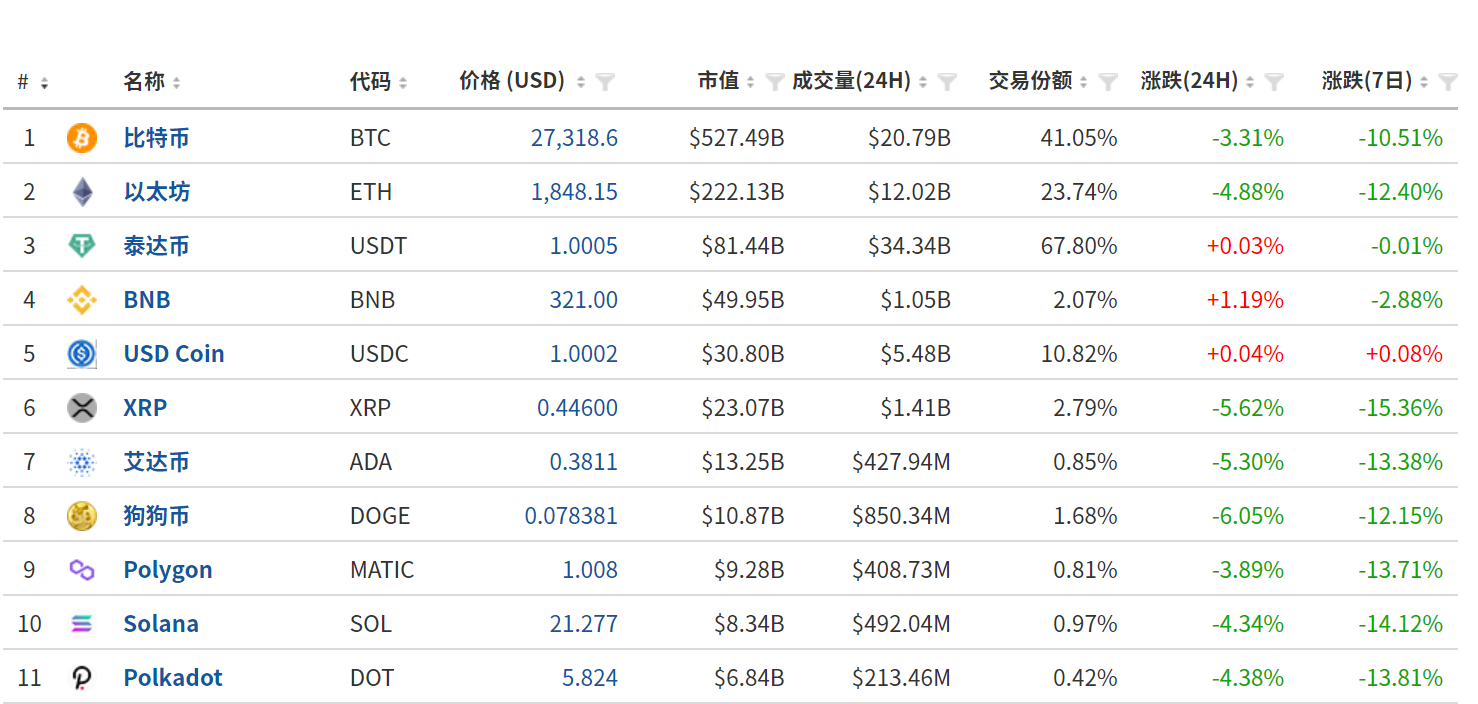截至发稿,比特币报27318.6美元,跌幅3.31%。其它加密币也纷纷下跌,狗狗币跌幅超6%,以太坊跌近5%。