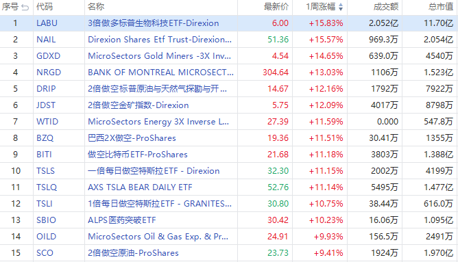 美股ETF方面,3倍做多标普生物科技ETF $LABU 大涨超15%领跑大市;黄金、比特币、石油本周集体下挫,3倍做空金矿ETF $GDXD 涨超14%,3倍做空石油指数ETF $NRGD 涨13%,做空比特币ETF $BITI 涨超11%。