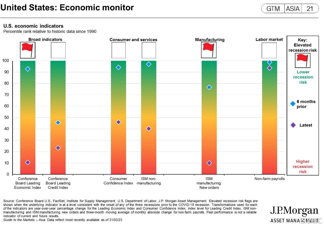 摩根大通资产管理部门发布报告表示,预计美国经济将进一步减速。美国经济6大指标(美国经济咨商局领先经济指标、美国经济咨商局领先信用指标、消费者信心指数、ISM服务业PMI、ISM制造业新订单指数、非农就业)均较6个月前指向更高的衰退概率,其中美国经济咨商局领先经济指标和ISM制造业新订单指数已处于历史低位。
