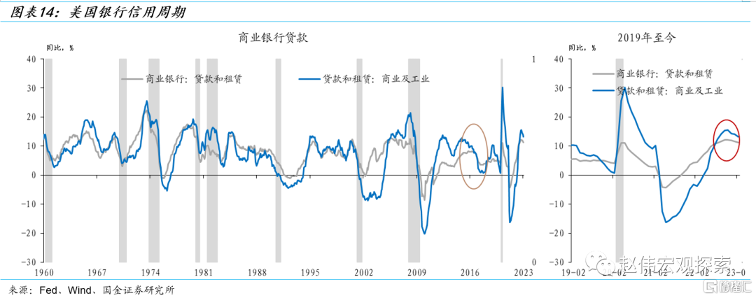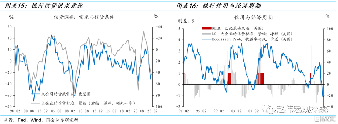 第三,信用周期所处的阶段不同:2015-2016年银行信贷供给小幅收缩,2023年则显著收缩,且仍将进一步紧缩。受全球经济不确定性和经济增速放缓的影响,2015-2016年美国商业银行也收紧了贷款标准(企业贷款需求也有所收缩),但收紧信贷标准的银行数量非常有限,持续时间也比较短,总信贷同比增速只是略有下降(未落入负增长区间)。2023年处于银行信用周期下行的早期,大量银行正在收紧信贷标准,企业贷款需求显著下行。历史经验显示,银行大幅收紧信用时,美国经济往往难以逃逸衰退——银行紧信用的行为往往是经济衰退风险上升的反映,又进一步抬升了经济下行的风险。