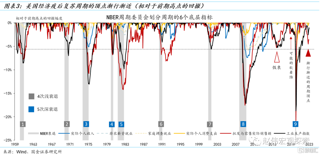 基于NBER的周期分析框架,美国经济已处在从放缓到衰退的“十字路口”,疫后复苏周期的顶点渐行渐近。截止到2023年2月,6个指标中已有4个指标出现了回撤:非农薪资就业(-0.1%,高点为2023年1月)、实际个人消费支出(-0.1%,高点为2023年1月)、批发与零售实际销售额(-3.7%,高点为2022年4月)和工业生产指数(-1.4%,高点为2022年9月)。但是,3月非农薪资就业又创了新高,工业生产指数的回撤幅度有所收敛(-1.0%)。故可以说,美国经济已处在从放缓到衰退的“十字路口”。