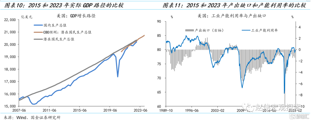 这次或许不一样。第一,经济周期阶段不同:2015-2016年为复苏中期,2023年已处在复苏尾声。截至2014年12月,美国失业率已降至5.6%,相比2009年10月的10%高位明显下降,但仍高于自然失业率水平,失业缺口仍为负,劳动供给大于需求(过剩劳动力约350万人)。然而,当前美国失业率位于历史低位,失业缺口为正,劳动缺口超过400万(峰值时约600万)。再结合产出缺口和产能利用率进行交叉验证可知,2015年处于复苏期(或复苏早期),2023年已处于扩张期(或复苏晚期)。按照周期律,复苏尾声与衰退的距离更近,因为经济中“剩余产能”已所剩无几,应对外生冲击的空间更小。